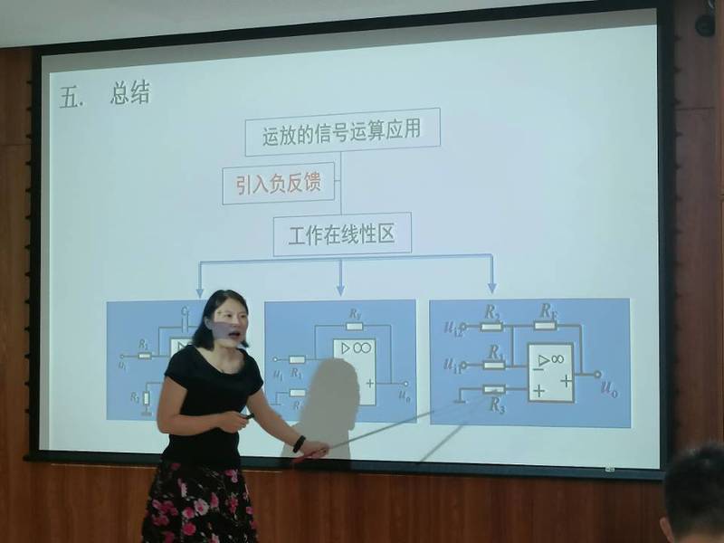 電工電子基礎(chǔ)課部的青年講師周鈺杰從PI自動溫度調(diào)節(jié)工程應(yīng)用的科普視頻入手,剖析任務(wù),并將其細(xì)化為三類運算放大器的負(fù)反饋使用?!鞍盐仗摱毯吞摂鄡蓚€方法,可以解決反向比例、反向加法和積分運算三大電路?!彼?dāng)堂布置學(xué)習(xí)通習(xí)題檢驗教學(xué)成果,富有穿透力的聲音感染了在場觀眾。