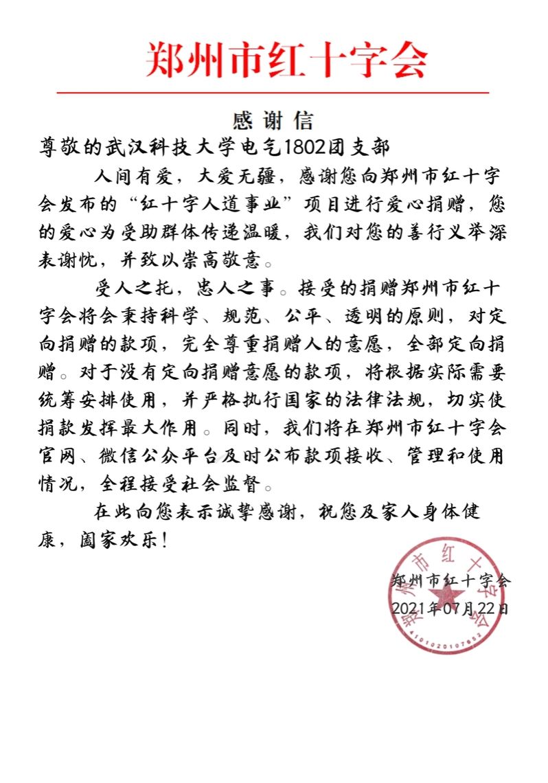 “人間有愛,大愛無(wú)疆,感謝您向鄭州市紅十字會(huì)發(fā)布的紅十字人道事業(yè)項(xiàng)目進(jìn)行愛心捐贈(zèng)。”7月22日上午,集團(tuán)電氣1802班團(tuán)支書茹偉宇在支部成員的一致贊同下,將評(píng)選為“紅旗團(tuán)支部”的600元獎(jiǎng)金捐給鄭州遭受洪災(zāi)的人民,幫助他們挺過(guò)難關(guān)。