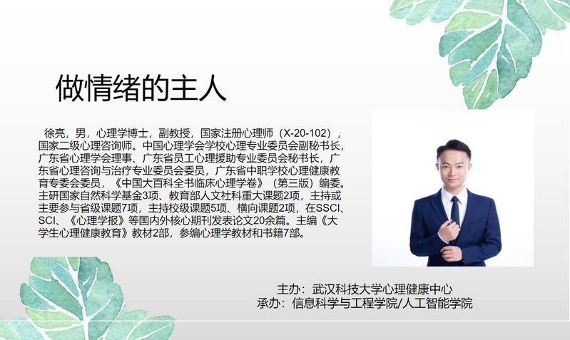 報(bào)告會(huì)圍繞情緒展開(kāi),由認(rèn)識(shí)情緒與情緒管理兩部分組成。徐亮認(rèn)同情緒對(duì)行為有著很大影響。首先通過(guò)各種的圖片,主講人徐亮帶領(lǐng)同學(xué)們認(rèn)識(shí)了情緒,解讀了圖片中不易察覺(jué)的情緒。隨后講述該如何管理情緒,分享了很多的方式方法。其中包括“正念療法”,告訴同學(xué)們“正念療法是更多的去關(guān)注當(dāng)下,可以通過(guò)散步等方式?!?/p>