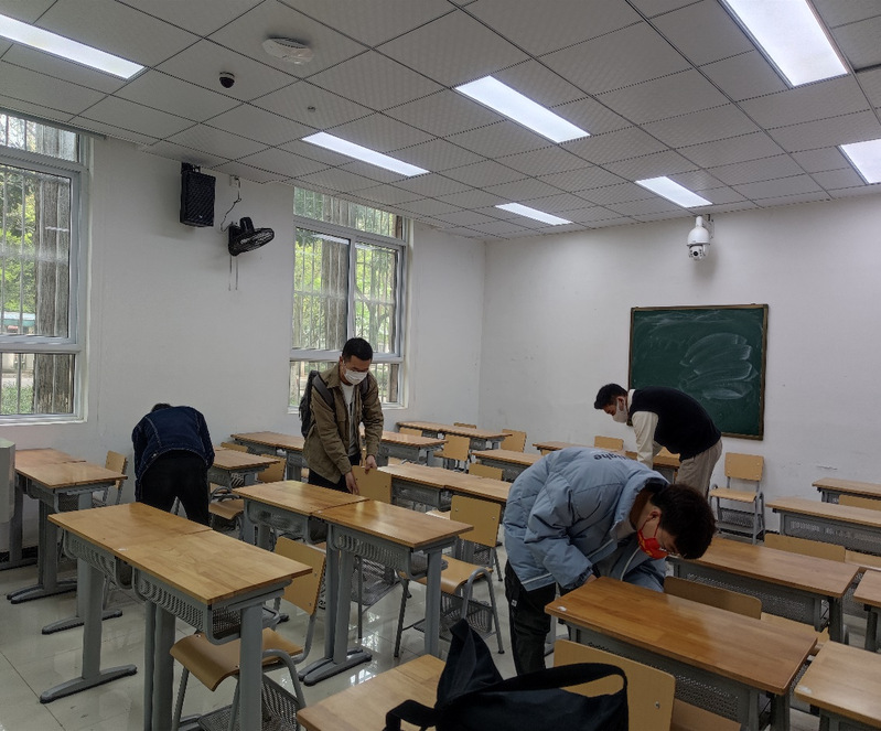 我們對教三樓各個教室進行了查看,發(fā)現(xiàn)許多教室存在桌椅擺放不規(guī)整,課桌內(nèi)還留有部分垃圾。為此我們將成員分成了四組對每一層樓進行清理,每一組中一人負責教室抽屜垃圾處理、兩人負責課桌椅擺放、還有一人負責黑板擦拭等工作。組內(nèi)成員的積極性很高,在大家的互幫互助下,經(jīng)過一上午的處理,各個教室的衛(wèi)生環(huán)境得到了改善。
