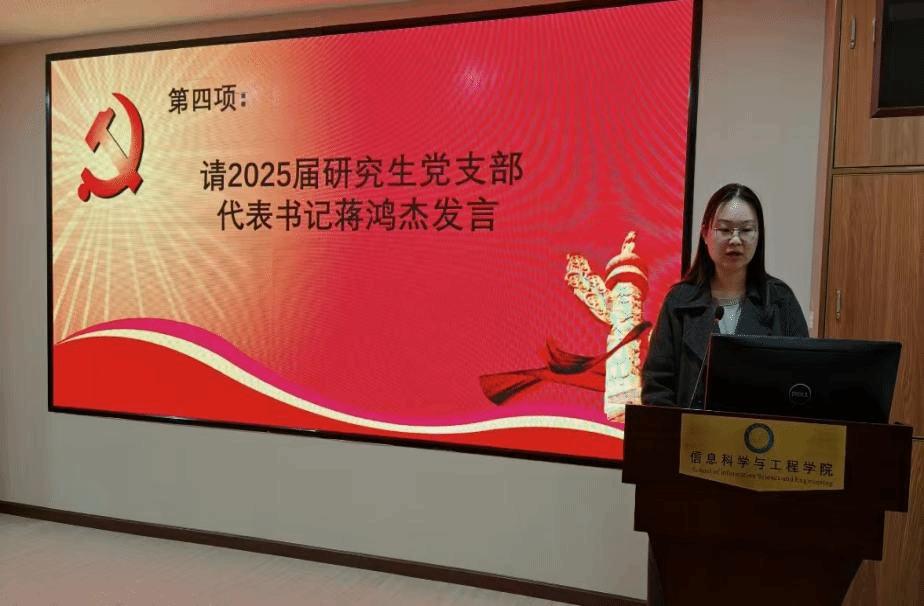 電子信息學院2025屆研究生黨支部代表書記蔣鴻杰發(fā)言。她提出了新一屆黨支部的工作計劃和目標,強調(diào)將圍繞學校和學院的中心工作,進一步加強黨支部的組織建設和思想建設。蔣鴻杰提到,新一屆黨支部將注重黨員的培養(yǎng)和發(fā)展,通過開展專題講座、交流研討等活動,提升黨員的綜合素質(zhì)和業(yè)務能力;同時,將積極探索創(chuàng)新黨建工作模式,開展具有特色的黨建活動,增強黨支部的吸引力和影響力。她還表示,新一屆黨支部將更加注重服務同學,積極為同學們辦實事、解難題,努力使黨支部成為同學們的堅強后盾。蔣鴻杰最后表示,新一屆黨支部將團結(jié)帶領全體黨員,以更加飽滿的熱情和昂揚的斗志,為推動黨支部的發(fā)展和學校學院的建設貢獻自己的力量。